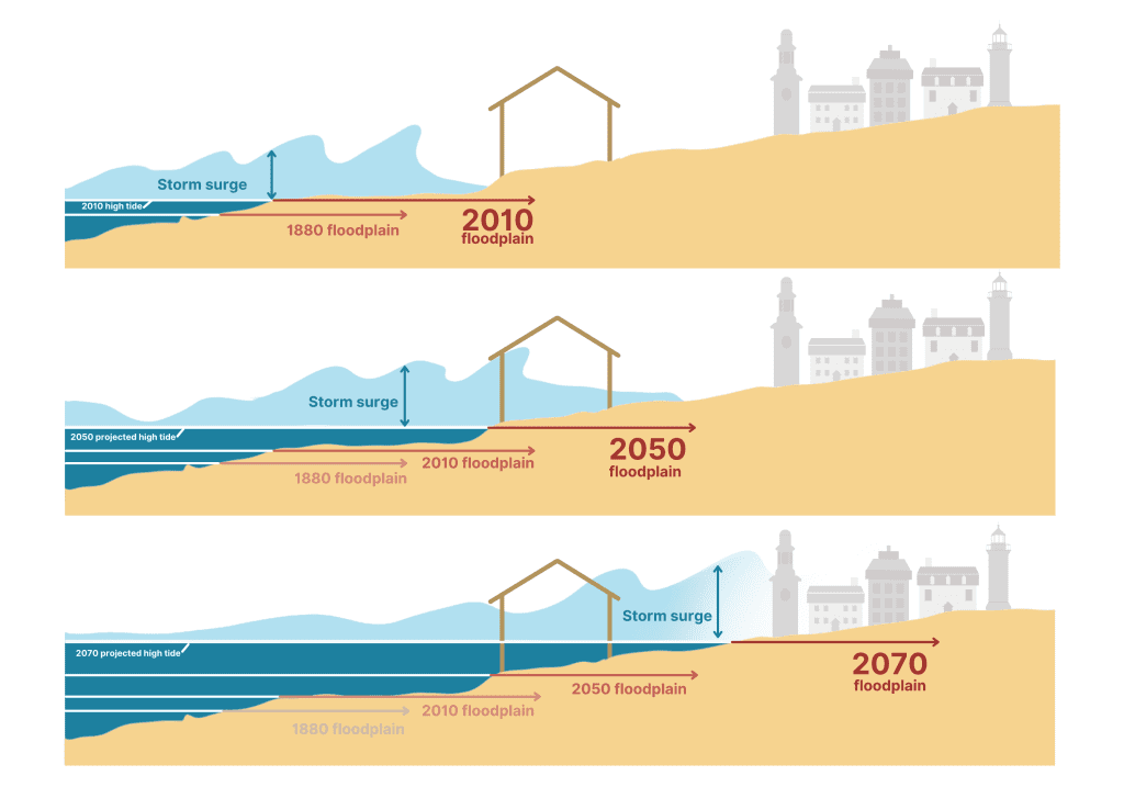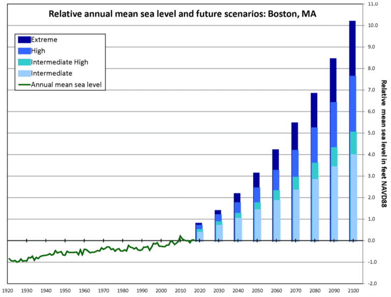 While sea level along the U.S. coastline is projected to rise by one-foot in the next 30 years, Boston and the North Shore are predicted to experience between 0.7-1.4 feet of sea level rise by 2030. By the end of the century, we could see between 4-10 feet of sea level rise depending on fossil fuel emissions.