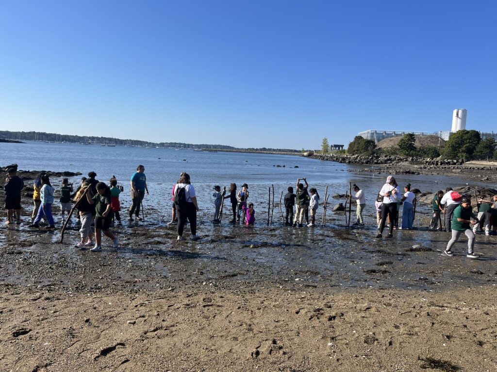 The purpose of this activity is to bring an important Indigenous Massachusett Tribe custom back to life in Salem. The indigenous peoples of Massachusetts knew how to interact with their environment in a sustainable manner. As our area faces continued threats to coastal resiliency and marine biodiversity, these students learned both an important history lesson and how to coexist with nature while minimizing harm to it. The Massachusett Tribe at Ponkapoag has demonstrated fishing weir reconstructions in Boston Common in years’ past, but this is one of the first fishing weirs built out on the water in the Salem Sound in over 400 years!