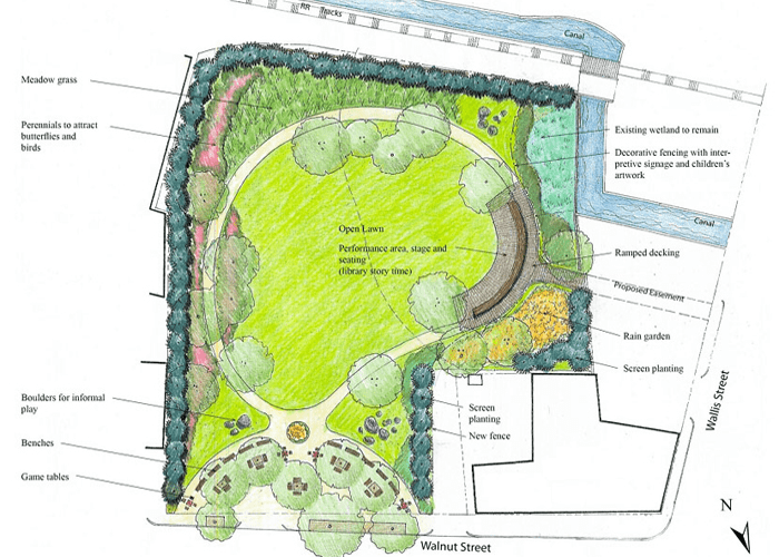 Because of its industrial past, residents and businesses turned their backs to the river. In 2012, the City began to change this with the purchase of a vacant brownfield at 45 Walnut Street. The site was remediated, and the East End Peabody Veterans Memorial Park was created. Bordering the North River Canal, it serves as an open green space for passive and active recreation and flood storage.